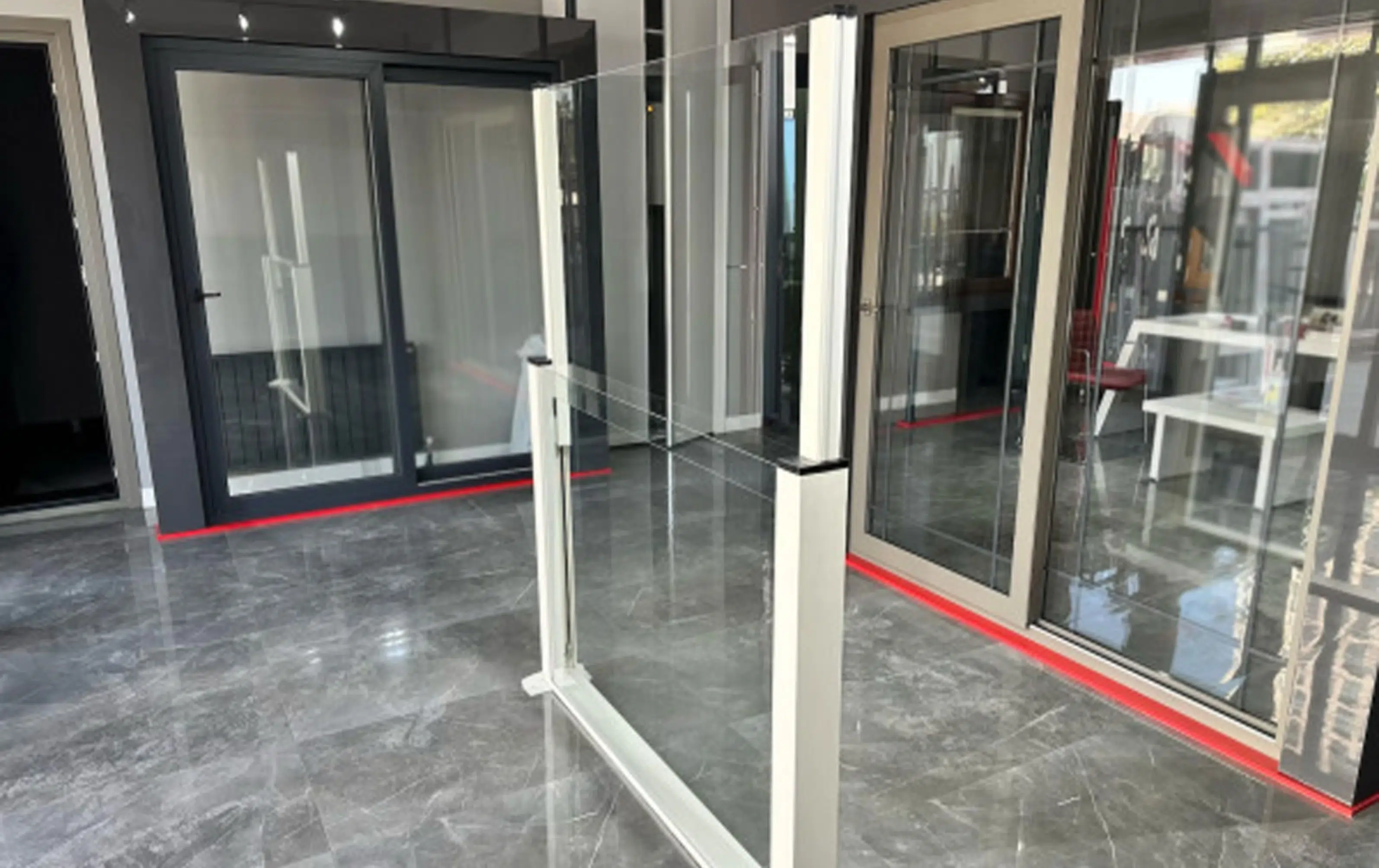 Windschutzsystem; Es macht Wohnräume komfortabler und unverzichtbarer durch die vertikale Bewegung von manuellen, Kolben- und motorisierten Paneelen, die aus zwei Paneelen bestehen, um vor den negativen Auswirkungen von Wind an Orten wie Hotels, Cafés, Restaurants, Wohnhäusern, Terrassen und Einkaufszentren zu schützen.